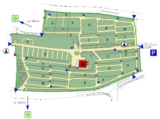 Der Plan dient der Orientierung auf dem Friedhof in Unterkochen bei der Suche nach vereinzelten Gräbern. Die einzelnen Abteilungen und ihre Bezeichnungen sind eingezeichnet.